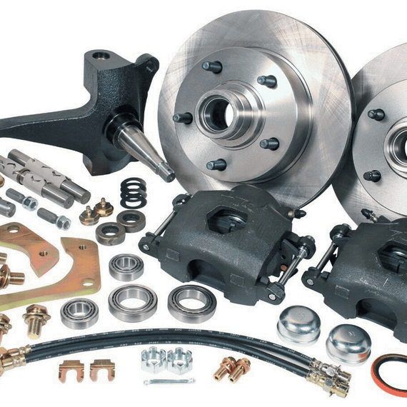 Disc Brake Kit contains parts needed to convert from front drum brakes. 15-inch or larger wheels must be used with kit. A new disc brake master cylinder is needed. Use #45-3587 for manual brakes or #45-3588 for power brakes. Requires use of #45-3589 combination valve. Fabrication of new front brake lines is required.